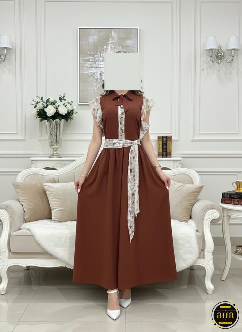 يتميز الفستان بلونه البني الهادئ ، الذي يعكس الإحساس بالنعومة والرقي.تصميمه أنيق ومميز بقصة منسدلة تضفي لمسة من الفخامة