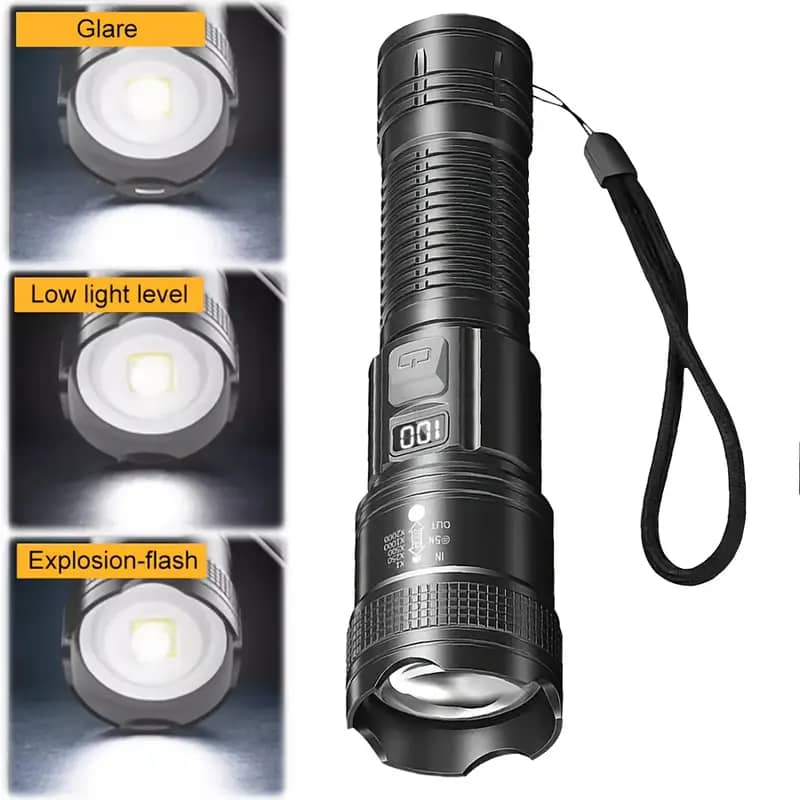 هذا المنتج عبارة عن مصباح يدوي (كشاف) تكتيكي قابل لإعادة الشحن، ويتميز بالمواصفات التالية: